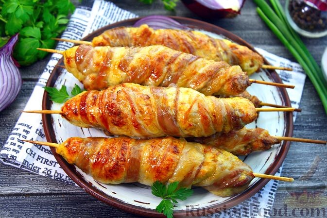 - Куриные кебабы в беконе: Нежные кусочки куриного филе обёрнуты хрустящим беконом и запечены до золотистой корочки. Они просто идеально подойдут как альтернатива традиционному шашлыку.