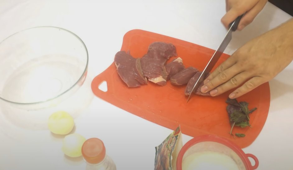 Первый шаг заключается в нарезке мяса на небольшие куски. Лук также мелко порезать и смешать с мясом в глубокой миске. При перемешивании важно хорошо сжимать массу руками, чтобы лук выделил сок и добавил сочности.