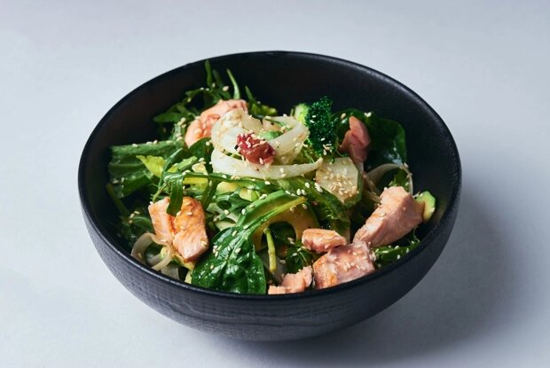 1. Начните с подготовки лосося: посолите рыбу, добавьте перец и слегка смажьте оливковым маслом. Запекайте в духовке при 180 градусах в течение 10 минут.