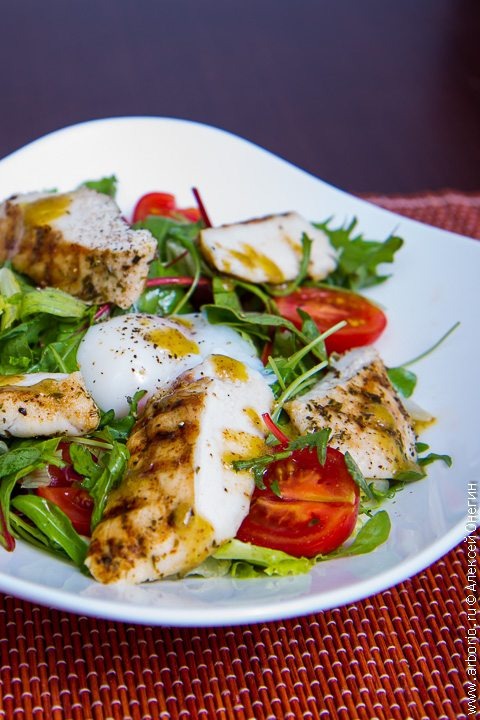 В этом рецепте лучшей нотой выступает обжаренная картошка, святой грааль тёплого салата с курицей, рядом с которой — румяные кусочки куриного филе и нежное яйцо пашот, выступающее в качестве связующего элемента. Так что, важно уточнить: это всё-таки салат или полноценное основное блюдо? Скорее всего, это оба варианта!
