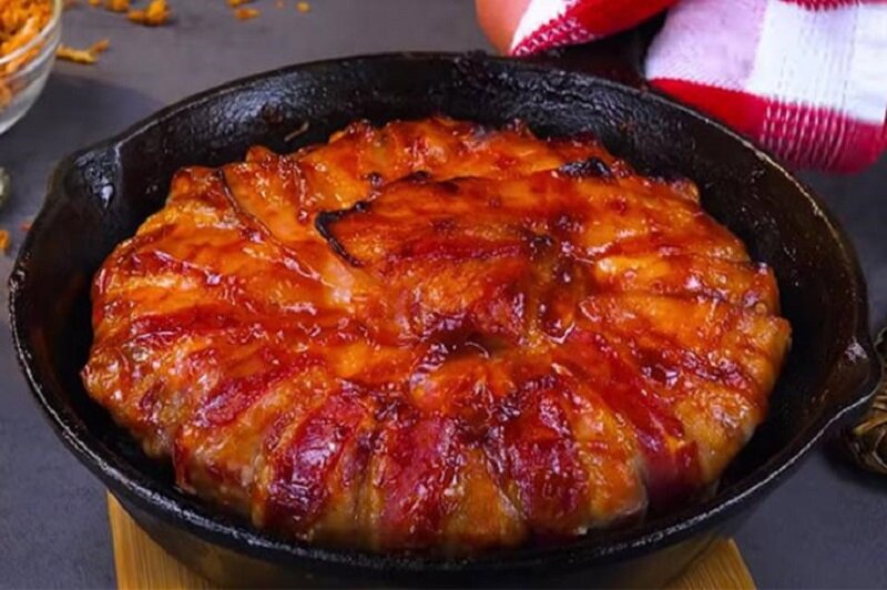 Закрыть пирог следует оставшимися ломтиками бекона, сворачивая их к центру. Сверху можно намазать шашлычным кетчупом или другим томатным соусом по желаниям.
