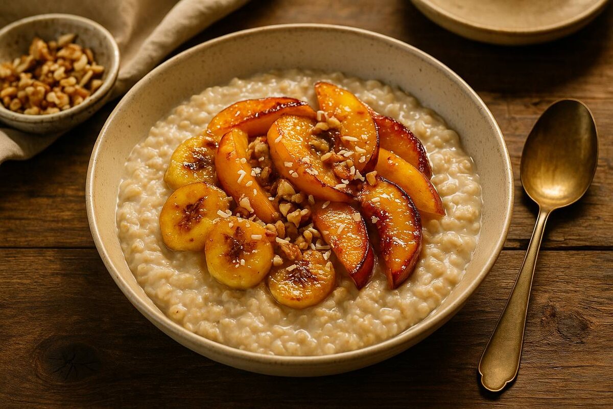 Завтрак — это важная часть дня, однако с течением времени даже любимая овсянка может стать рутинной. Но что если начать утро с чего-то по-настоящему уютного и вкусного, чтобы пробудить как тело, так и настроение? Мы нашли простой способ превратить привычную кашу в настоящее гастрономическое наслаждение: добавив кокосовое молоко и карамелизированные фрукты. Получается не просто вкусно, но и полезно — будто десерт, но без излишков.