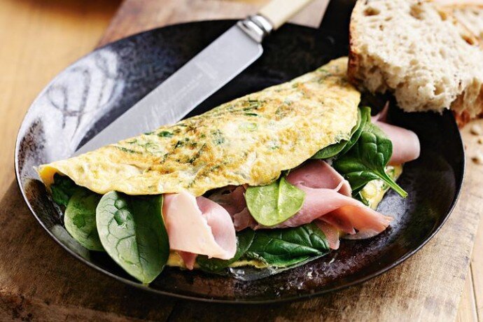 На одну половину омлета уложите ветчину и оставшийся шпинат, затем аккуратно сложите омлет пополам и переложите на тарелку.