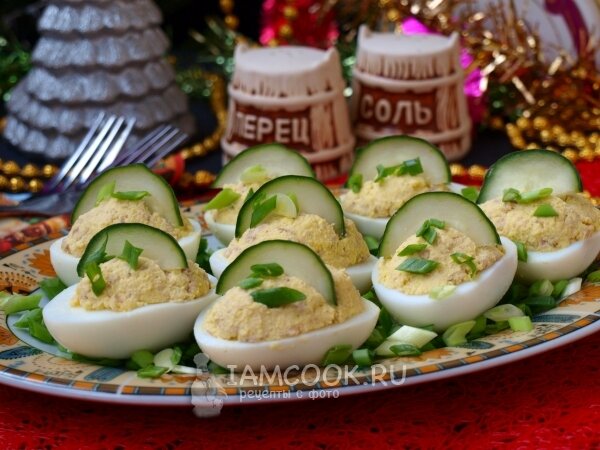 4. Для придания яркости закуске, фаршированные яйца можно украсить мелко нарезанным свежим огурцом и зеленым луком. Приятного аппетита!
