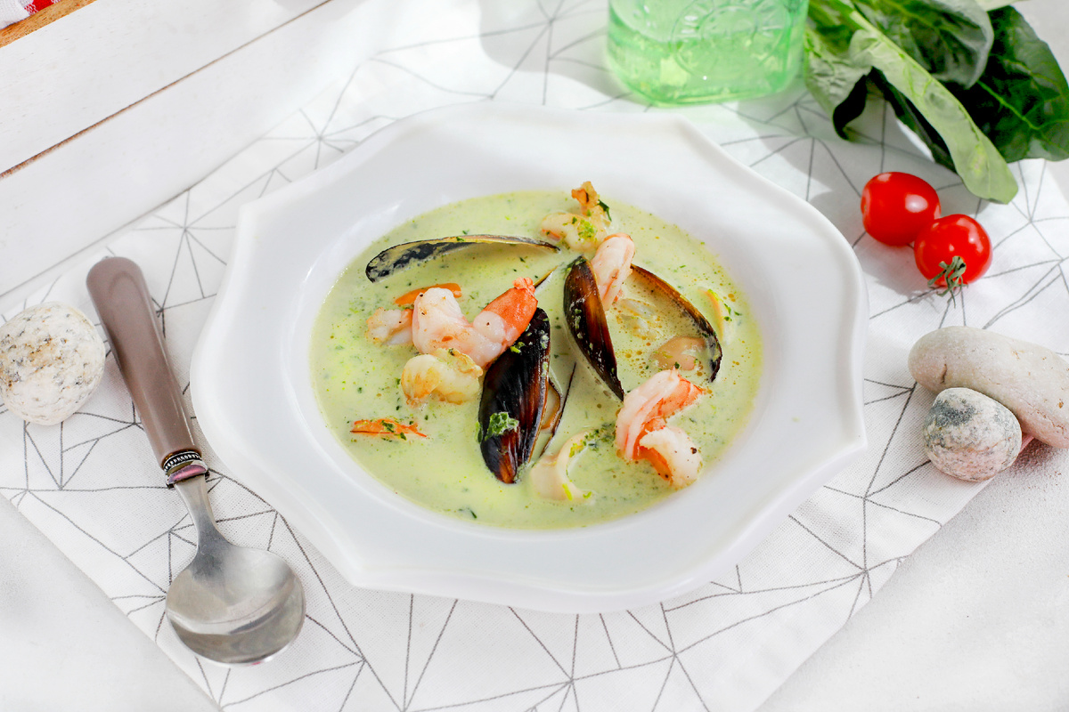 Приготовление вкусного зеленого карри супа с морепродуктами и шпинатом займет всего 30-35 минут, а итоговый вес блюда составит около 1400 граммов для четырех порций.