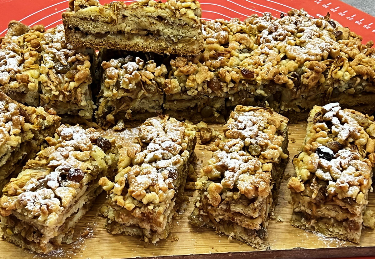 По истечении времени достаньте тесто из холодильника. На присыпанном мукой столе разделите его на три равные части. Один кусок раскатать так, чтобы он лег на дно формы размером 20х30 см. Выложите на тесто яблочную начинку, равномерно распределив ее. Повторите процесс с оставшимися частями теста, собирая пирог. Из остатков теста можно скатать шарики и присыпать ими поверхность пирога для красоты.