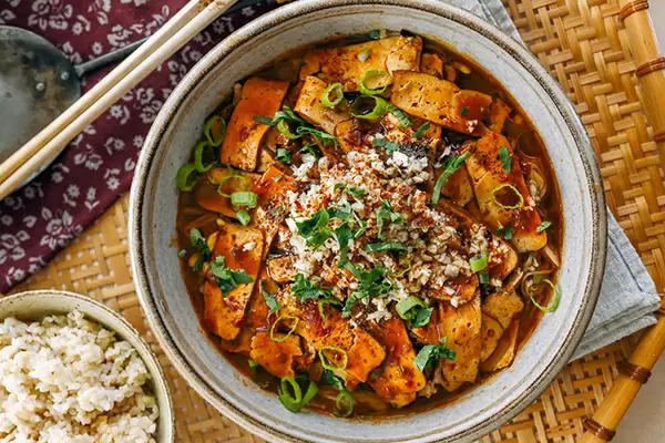 Как правило, это приготовление подразумевает использование говядины или рыбы, которые варятся в насыщенном, обжигающе остром соусе. В этом же рецепте действенной заменой выступает плотный прессованный тофу, который не уступает мясу по восприятию вкуса.