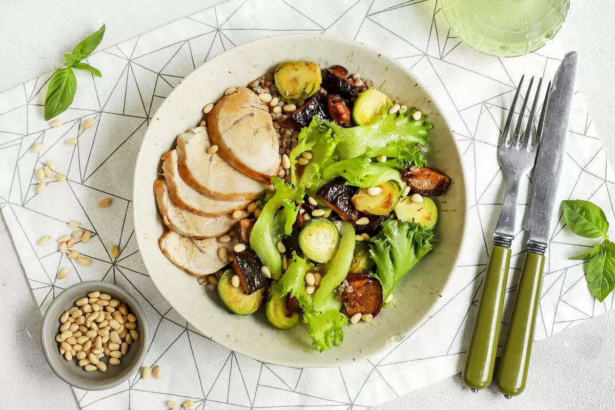 Разогреть духовку до 180°C.Индейку обсушить бумажным полотенцем и приправить солью.Обжарить мясо на сковороде с 1 ст. л. растительного масла по 1 минуте с каждой стороны на сильном огне.Добавить сливочное масло, уменьшить огонь до среднего и готовить 3-5 минут.Переложить индейку на противень с пергаментом и запекать 10 минут.После охлаждения нарезать ломтиками.Гречку отварить в 350 мл кипящей подсоленной воды на медленном огне под крышкой 7-10 минут до полного испарения жидкости.При необходимости добавить немного кипятка для завершения приготовления.Брюссельскую капусту отварить 2-3 минуты в 1 л воды, затем разрезать пополам.Обжарить капусту и грибы шиитаке на сковороде с 1 ст. л. масла в течение 2-3 минут.Добавить соус хойсин и лимонный сок.Приготовить соус, смешав кунжутное масло, соевый соус и лимонный сок.Собрать боул: выложить гречку, ломтики индейки, салат и овощи с грибами.Посыпать кедровыми орехами и полить соусом.Также можно обжаривать индейку на сковороде 6-7 минут на среднем огне, затем дать ей отдохнуть под крышкой 7-10 минут.Приятного аппетита!