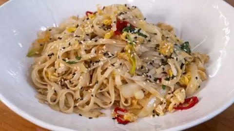 Отварите удон в подсоленной воде. Пока он готовится, нарежьте лук полукольцами, имбирь мелко, а чеснок и перец — тонкими кольцами. На раскаленной сковороде разогрейте масло, разбейте яйцо и слегка перемешайте, обжаривая до готовности. Далее добавьте лук, имбирь и чеснок, и жарьте на сильном огне. Спустя минуту добавьте готовый удон, сахар, соевый соус и сок лайма. Не забудьте положить листья базилика в конце. Подавайте с посыпкой жареного кунжута!