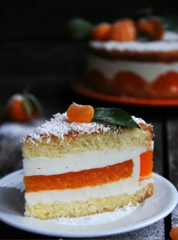 После сборки оставить торт в холодильнике на ночь. Перед подачей, аккуратно снять бортики формы и украсить кокосовой стружкой и дольками мандарина. Такой тортик обязательно удивит всех своим неповторимым вкусом и текстурой!