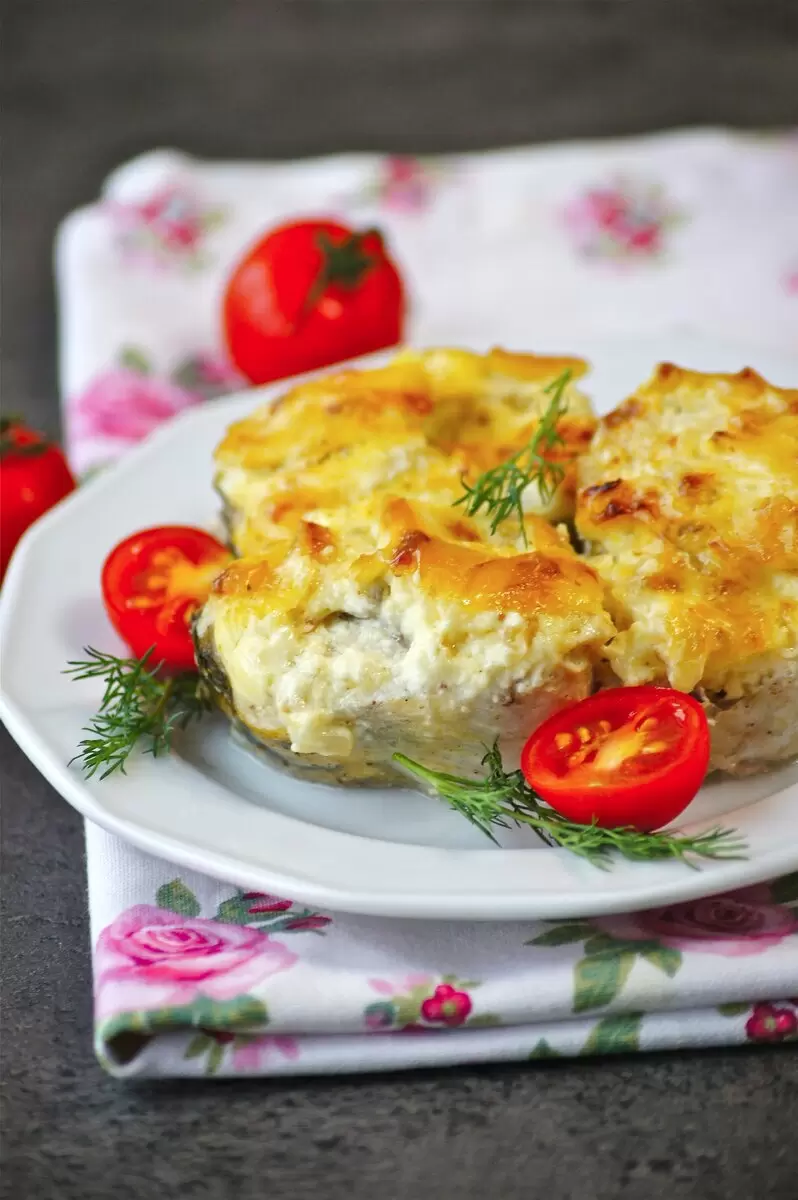 Рыбу нарезают на порционные куски, которые помещают в огнеупорное блюдо. Сверху их обсыпают солью и специями, слегка втирая их в мясо. Лук обжаривается до золотистой корочки и добавляется к смеси из майонеза или сметаны, после чего все это равномерно распределяется по рыбе.