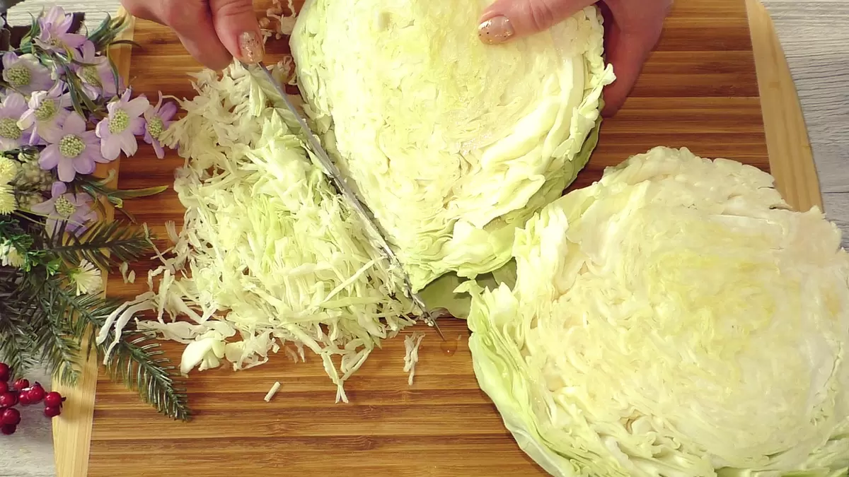 Первым делом, капусту необходимо нашинковать. Объём в 600 г подходит для одной готовки, но его можно увеличивать по мере необходимости.