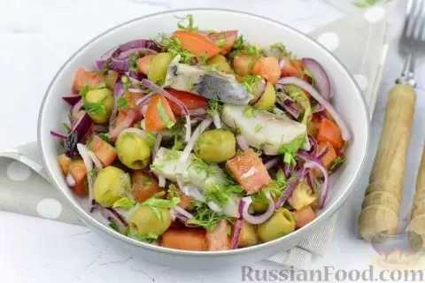 Салат с селедкой, свежими помидорами и оливками — отличный пример простоты и оригинальности. Для его создания вам понадобятся: