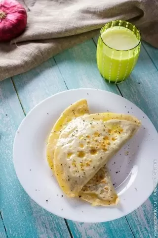 - Классический вариант — простое сочетание зелени, например, укропа, петрушки и зелёного лука, завернутое в тонкое тесто.