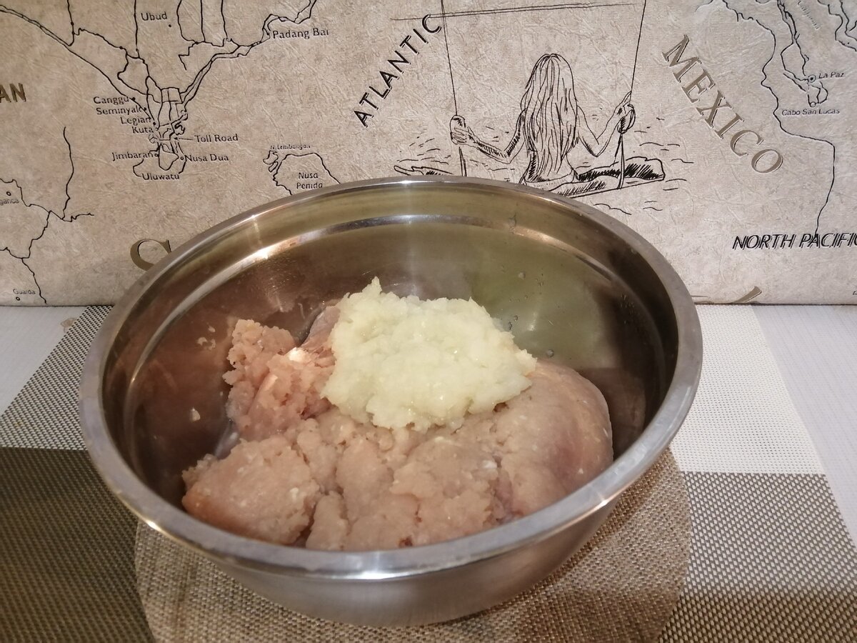 Для начала лук следует мелко нарезать, воспользовавшись мясорубкой или блендером. Полученную массу смешивают с куриным фаршем.