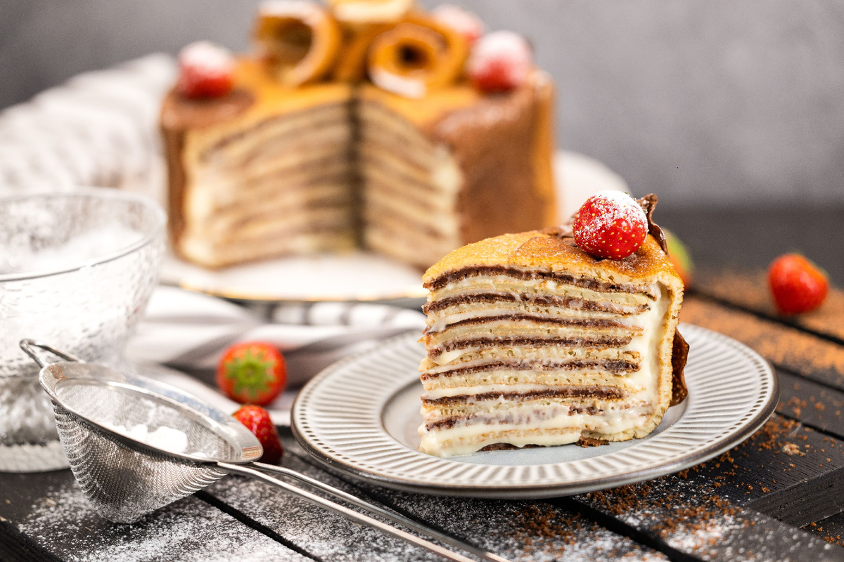 Сегодня предлагается взглянуть на блины под новым углом. Это не просто стопка, а настоящий блинный торт – высокий, праздничный и, безусловно, домашний. Каждый слой этого шедевра словно маленькое признание в любви, где светлые и темные блины чередуются, создавая симфонию воспоминаний. Крем соединяет их в единое целое, а свежая клубника и щепотка сахарной пудры делают его поистине особенным. Такой торт – это не просто десерт, а сердечное «спасибо» всем тем, кто дарил нам радость в детстве.