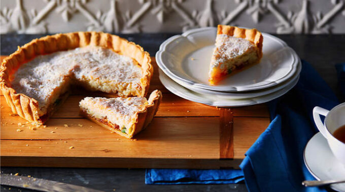 Из холодильника достается форма с тестом, на дно которого накладывается слой джема. Затем укладывается фруктовая начинка и покрывается миндальной меренгой. После посыпки сахаром, торт отправляется в духовку при температуре 180°C на 30 минут.