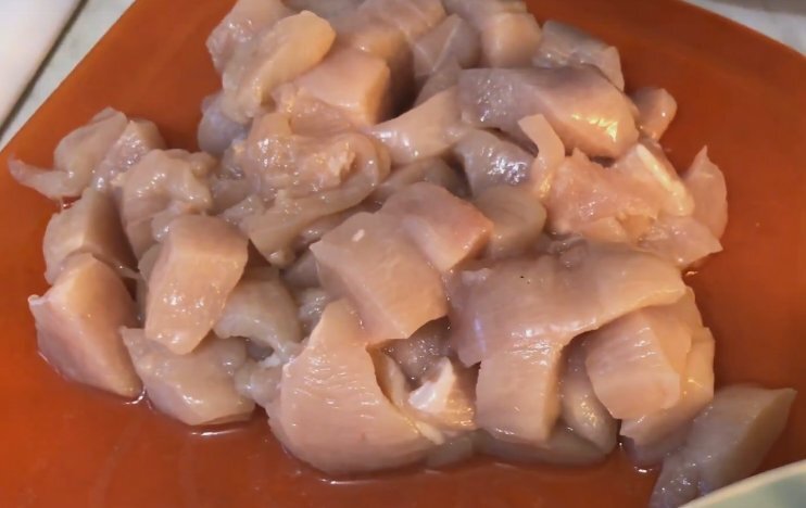 Начинать стоит с подготовки ингредиентов. Лук нарезается полукольцами, морковь — тонкой соломкой, а куриное мясо — небольшими кубиками.