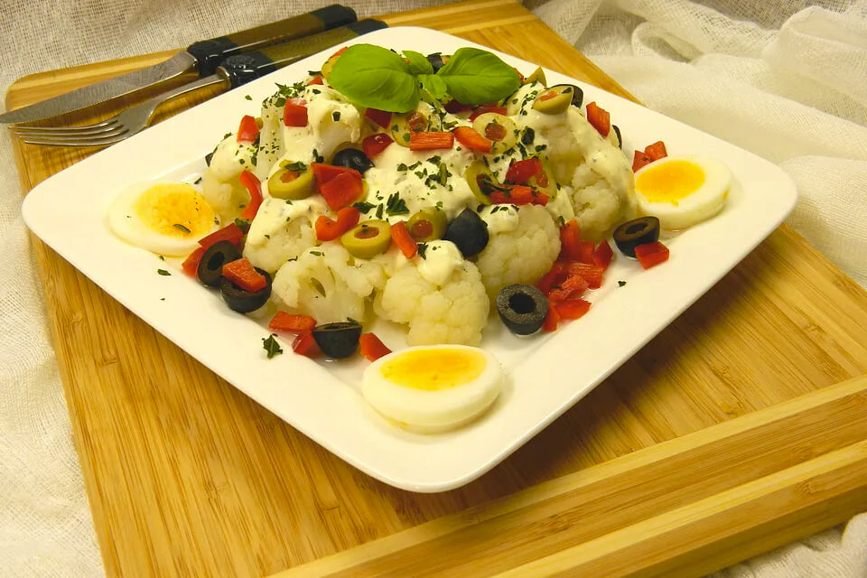 Теперь пришло время собрать салат. На блюде разместите цветную капусту, а вокруг — отваренные яйца (порезанные на половинки или четвертинки), оливки и сладкий перец. Затем приготовьте заправку: смешайте сметану с горчицей и рубленым чесноком, добавьте соль и перец по вкусу. Заправьте салат и при желании посыпьте зеленью.