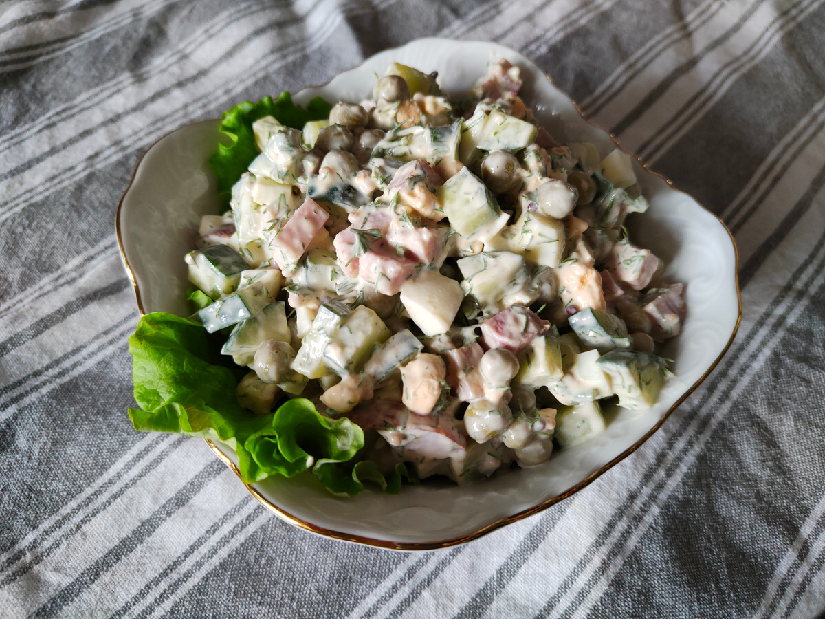 Этот салат — символ новогоднего стола, в который традиционно входили картофель, морковь, яйца, колбаса, консервированный горошек и солёные огурцы. Рецепты варьировались: кто-то добавлял лук, а кто-то обошёлся лишь простым набором. Редкие экземпляры включали и отварное мясо, что придавало блюду роскошный вкус.