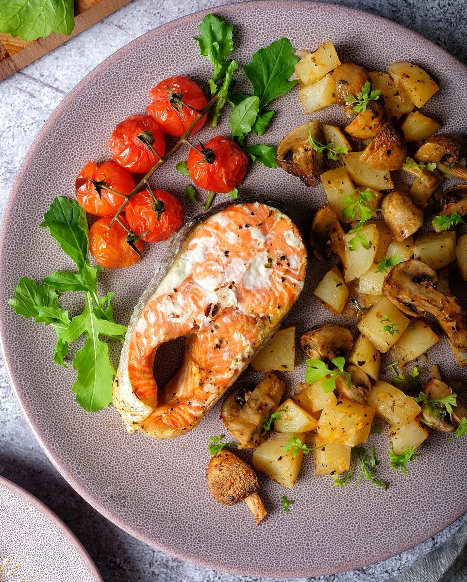Предлагается быстрое и легкое решение для семейного ужина: аппетитный стейк из нерки с гарниром из картофеля, грибов и помидоров. Это блюдо не требует сложных ингредиентов и готовится в одном противне, что существенно экономит время на уборку.