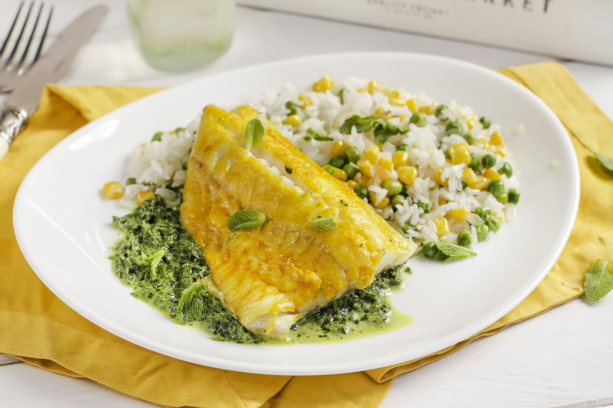 Шаг 5: На тарелки выложите рис с овощами, рядом расположите рыбу. Полейте треску шпинатом со сливками и подавайте сразу же, украсив остатками мяты.