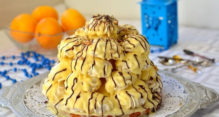 На собранный торт нанесите крем, выкладывая слои безе и каждый раз покрывая их кремом. Можно добавить орехи и растопленный шоколад сверху для завершенности оформления. Ваш десерт «Графские развалины» готов удивить вас и ваших близких!
