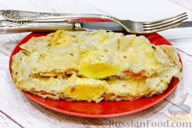 - Яичница с помидорами и сыром в лаваше. Этот аппетитный вариант подкупает своей простотой. Залив разболтанные яйца вместе с помидорами и тёртым сыром в мягкий лаваш, можно быстро и вкусно позавтракать или перекусить в дороге.