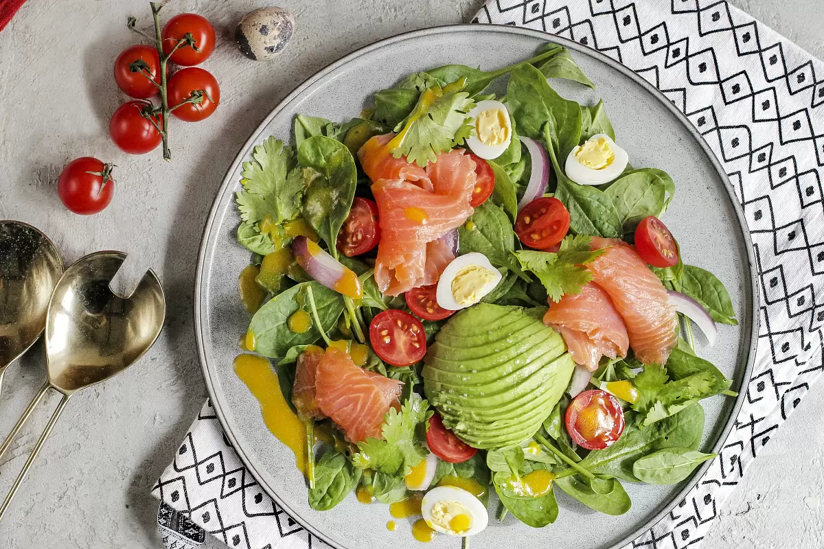 Шаг 3: На тарелке выложить шпинат, лук, черри, авокадо, рыбу и перепелиные яйца. Заправить всё соусом, посолить по вкусу и перемешать. Подавайте салат сразу же, ведь он лучше всего раскрывает свои ароматы в свежем виде.