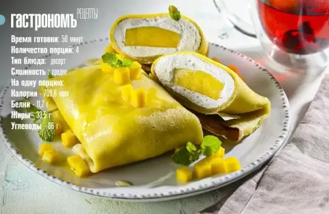 Для начинки взбить холодные сливки с сахаром и ванилью до плотной консистенции. На каждый блин накладывается пара столовых ложек сливок, ломтик замороженного манго, и всё это аккуратно заворачивается в конверт. После формирования все блинчики помещаются в морозильную камеру на 25 минут. Затем их нарезают пополам и сервируют с кусочками манго, листьями мяты и манговым сиропом.