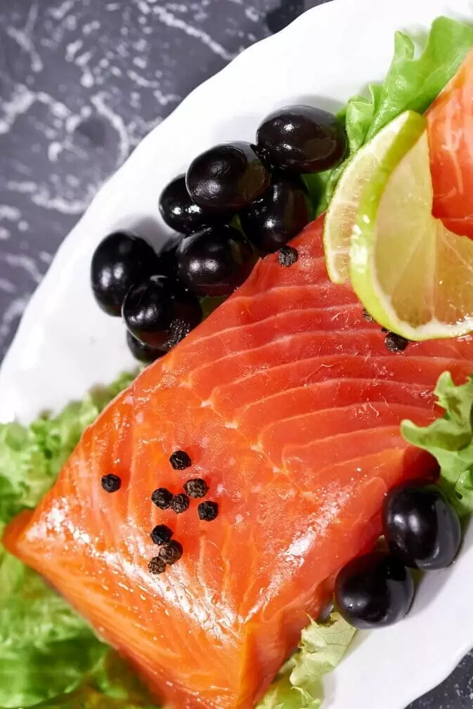 Подача: После указанных часов рыбу извлекают, сливают образовавшийся рассол и нарезают на порции, украсив маслинами и дольками свежих цитрусовых.