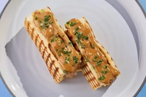 Капусту стоит нарезать и заправить соусом. Затем на один ломтик хлеба наносят тайский соус, выкладывают капусту и обжаренное бедро. Оба ломтика собирают вместе и обжаривают до хрустящей корочки.