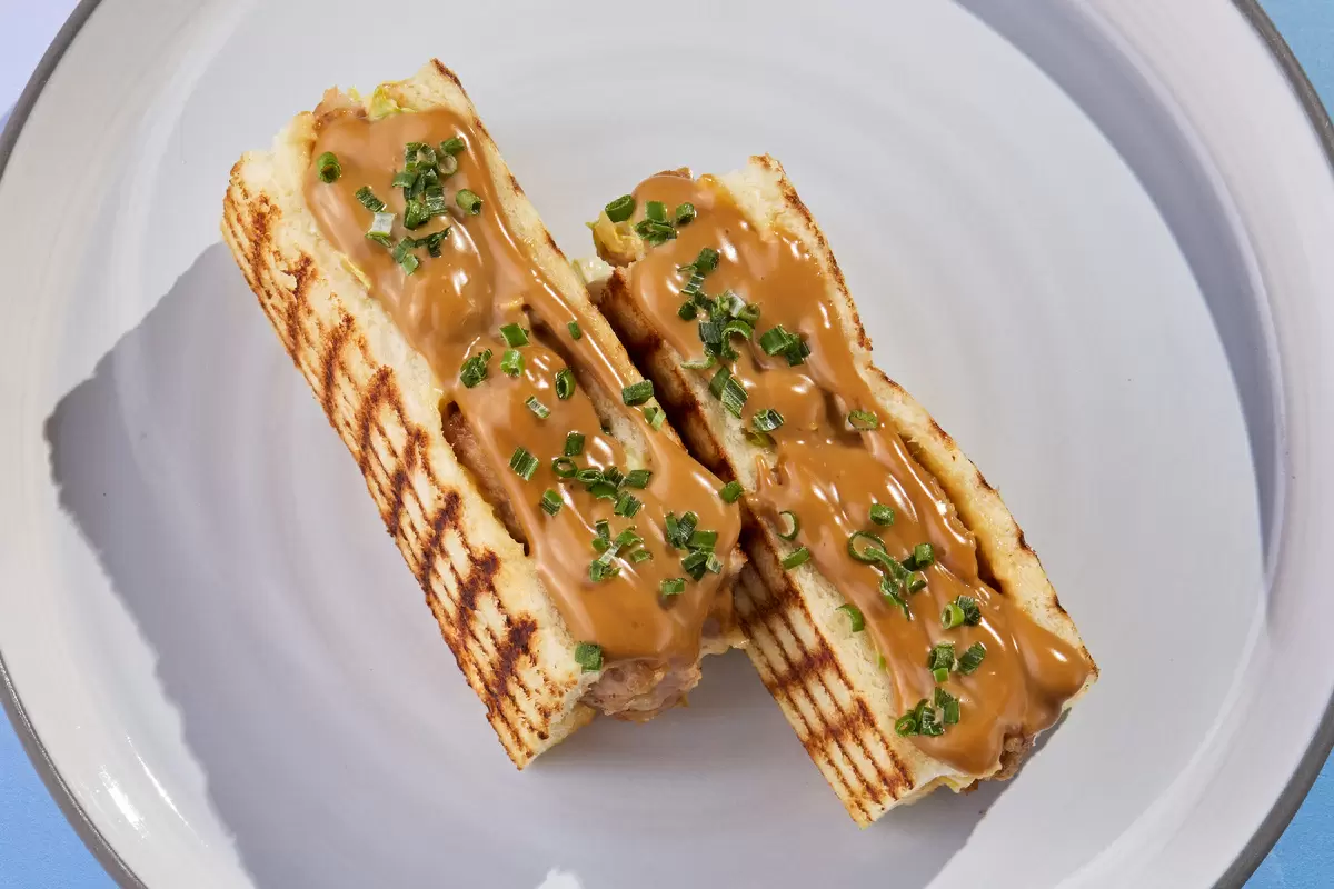 Перед подачей сэндвич разрезают пополам, выкладывают на тарелку, поливают соусом никкей и украшают свежим луком сибулет. Приятного аппетита!