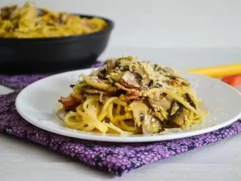 Паста карбонара с беконом и грибами: простой и бесподобный рецепт