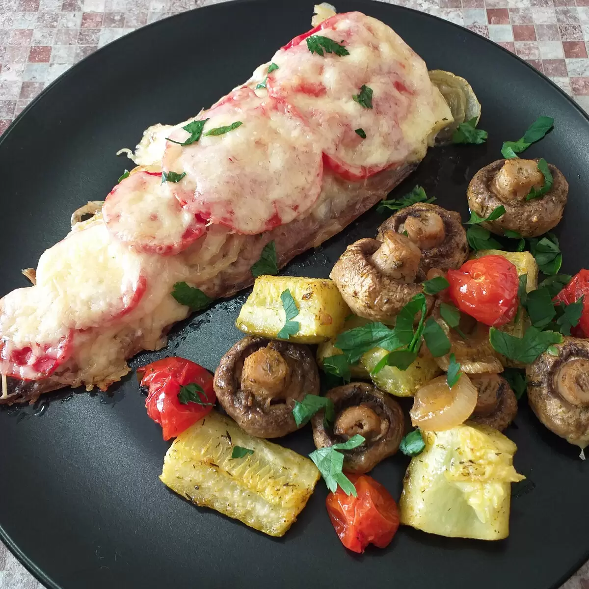 Подготовка начинается с разделки скумбрии на филе, после чего рыба помещается в маринад на 30-40 минут. Пока она впитывает ароматы, стоит заняться овощами: нарезать кабачок и грибы, приправить их по вкусу и дать настояться.