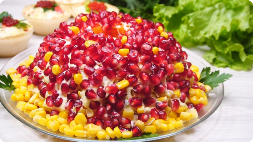 По завершении слоев следует накрыть миску плоским блюдом и быстро перевернуть. Снять пленку, обильно смазать верх и бока салата майонезом, посыпать зернами граната и добавить пару ложек кукурузы для ярких акцентов. Дать настояться в холодильнике в течение 1-2 часов.