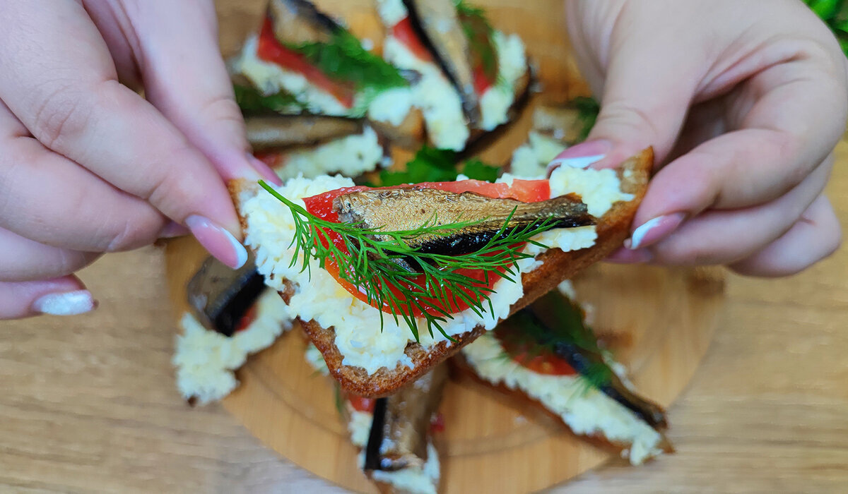 Завершающим штрихом становится шпрота: обычно достаточно положить одну крупную или две маленькие рыбки. Для украшения по желанию можно добавить немного зелени.