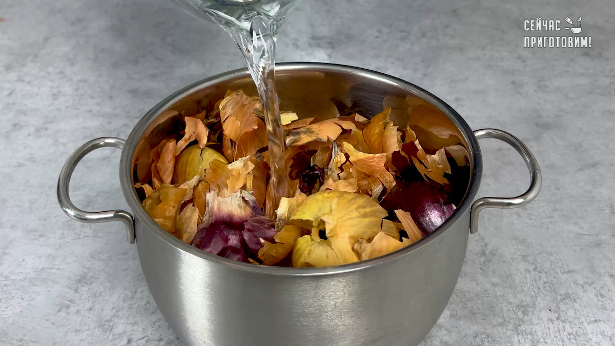 Приготовление начинается с луковой шелухи. В кастрюлю помещается около 20 граммов шелухи и литр воды. Смесь доводится до кипения и варится еще 30 минут. После этого огонь выключается, и отвар настаивается как минимум 2-3 часа, а лучше всего — оставить его на ночь для максимального аромата.