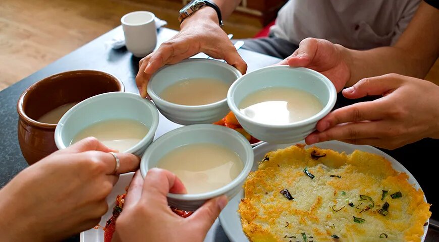 - МАКГОЛИ: Корейский слегка газированный напиток, который можно использовать в коктейлях и получать от него удовольствие в чистом виде.